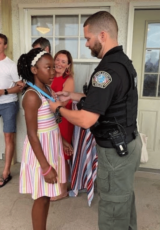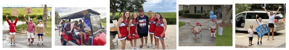 One of the most special events of the week is our finale "parade" from Sea Palms to the beautiful Village Creek Landing for our benediction dinner. For the last few summers as we've joined the procession, our hearts were exploding with gratitude as we passed by dozens of our friends and neighbors lining the streets, showing support of Blue Skies with waves, cheers, and homemade signs. Glynn County fire and police vehicles escort the parade of decorated golf carts, and police officers stay at Village Creek to award each patient and sibling a "Courageous Hero" medal. Crabdaddy's has surprised us with a complete donation of the evening's delicious meal, and we finish the week with fireworks at sunset. The camp's culmination in this way could not be a more glorious display of the warm hearts of our locals.