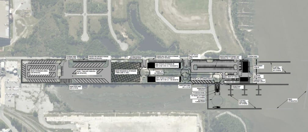 CHC Properties has designed and is permitting the Marina at Liberty Harbor. The permitting process is 99% completed, and CHC has received the LDP from the City of Brunswick. When fully developed, the marina will include 400-800 dry-stack storage units, over 70 trailer spots, a wash-down area, ample parking, approximately 75 water slips, a marina office, and a 5,000 SF restaurant. See the marina plan above.
