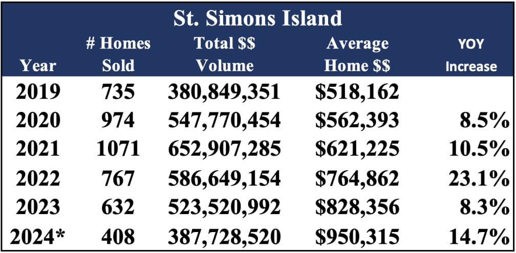 We have seen the average cost of a home on St. Simons increase by over 50% since 2019. Most of that increase occurred from 2020 to 2022 during COVID. The average house price on St. Simons went from $518,162 in 2019 to $828,356 in 2023. As you can see in the chart below, values have continue to grow. Interest rate hikes cooled transaction volume, but we continue to see significant value in new construction and renovations, particularly those that include a lifestyle component like a water/marsh view, walk/bike to the village/beach, or perhaps a home with a dock.